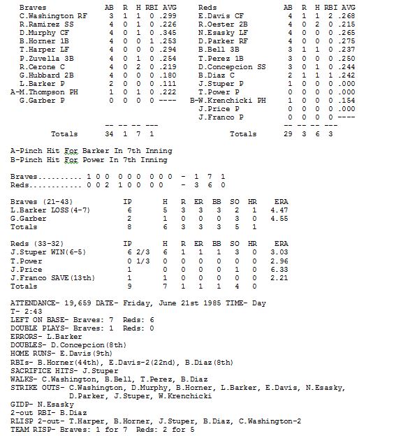 Cincinnati tallied 2 runs in the bottom of the 3rd inning. That early scoring was all that Stuper needed. Both teams' bats went to sleep after the 4th inning with no runs scored after that point.